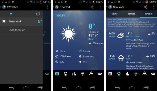 1Weather for Android is a really nice weather app for Android. It has a simple and elegant interface and comes with lots of features and options. This app provides you the weather in great detail and you get all the options you would expect of a good weather app. This weather app is really worth a try.