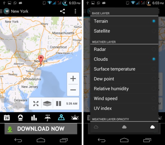 In the maps section you get comprehensive updates of radar, surface temperature, dew point, wind speed, UV index, clouds, and more. Below you can see the map with clouds. You can select other layers by tapping on the layer option and you will be provided with a list to choose from.