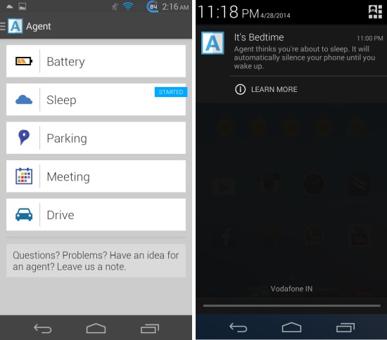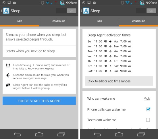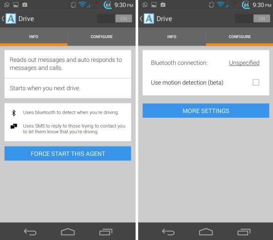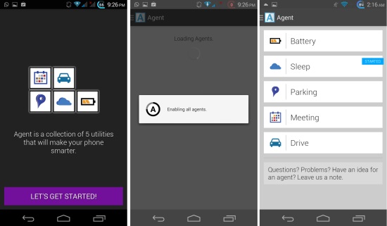 Agent for Android is a free app for Android which automates common tasks and also allows you to save battery. This single app automates tasks from 5 categories, which include: sleep, drive, meeting, parking, and battery. Agent for Android automatically reads SMS aloud, responds while you are driving, remembers where you have parked, saves the battery, silences phone calls when you are in meetings, and allows only urgent messages and calls while you are sleeping. It is an elegant, simple automation app that works perfectly. Best part is that there is no complex setup process; it’s really simple to use.