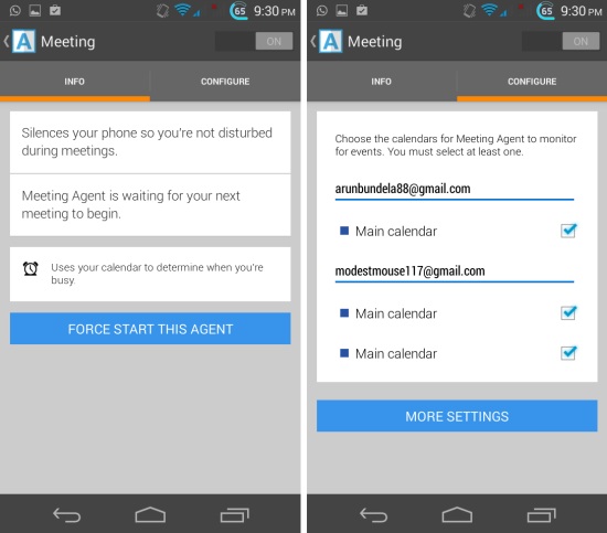 Meeting agent uses the calendar to automatically put your phone on vibrate or silence when you are in a meeting. Agent for Android uses your Gmail accounts to get calendar data; you can use multiple accounts if you like. These settings can be accessed in the configure tab as seen here.