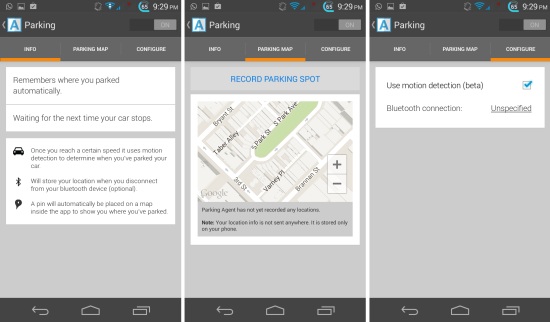 This one can be very helpful for some of us, including me. Parking agent automatically remembers where you parked, based on the Bluetooth connection or speed. It has the ability to remember up to five parking spots. The parking map records and shows your location. Configure tab allows you to use Bluetooth connection of your car or motion detection for parking detection.
