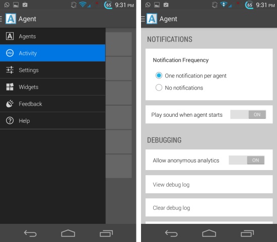 Pressing on the menu button gives you the access to other app options as seen here. From here you can tap on the settings options and you will have the setting in front of you which will allow you to configure Agent’s behavior and options according to your need.