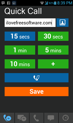In the above screenshot, I’ve scheduled the call after 15 seconds, and voila! After 15 seconds, I can see an incoming call from ilovefreesoftware.com ! The accept and reject sliders on this call work fine, and sliding the accept call slider will open up a timer screen, which looks pretty convincing, to say the least!