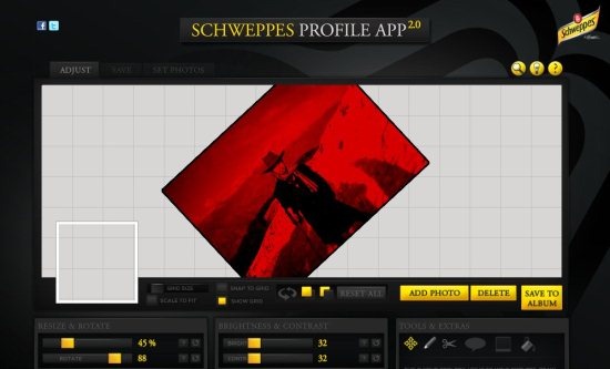Schweppes Profile App is a another free Facebook application using which you can create Facebook timeline covers that are fully customized. You can upload a single photo or multiple photos of you to this tool for creating a Facebook timeline cover. These tool allows you to adjust the transparency level and even allows you to give colors like red, green and blue to your photos. You can even rotate and resize images to make them suitable for your Facebook timeline cover. If you are looking for a simple tool to create Schweppes, then it’s worth trying out Schweppes profile app.