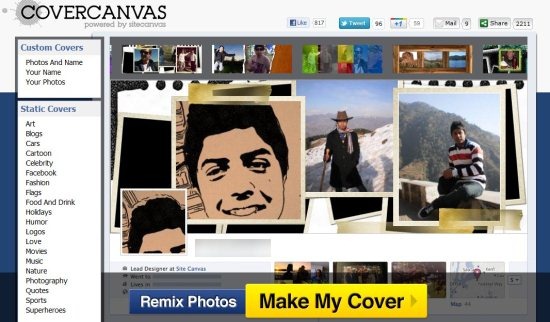 Covercanvas is a free tool which helps you to create fully customized Facebook timeline covers. This free tool includes static covers and custom covers, Static covers are basically those covers which remain as it is, you cannot customize them for example, covers related to celebrities, arts, movies, etc. Custom covers are basically customizable covers, you can create Facebook timeline covers using your photos and name, using name only or using photos only. This free tool even allows you to easily remix photos for creating Timeline cover that suits you the best. Covercanvas is an easy to use Facebook application, so even the beginners could create stunning Facebook timeline covers in no time.