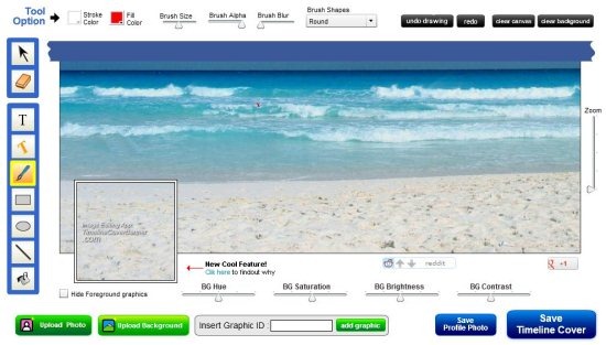 TimeLine Cover Banner is a free online application that lets you create fully customized timeline covers in no time. This free online tool offers a wide range of cover backgrounds to choose from, you can even upload your own custom backgrounds and images for creating your own custom timeline covers. This online application even allows you to add text, drawings, various shapes, you are even allowed to adjust the brightness, saturation, contrast etc according to your preference. Timeline cover banner comes with various tools like circle, rectangle, paint brush, text tool, eraser, etc. In addition, this application provides adjustable tool options for each tool. After creating a Facebook Timeline cover, you are allowed to save it in PNG format, which you can later on manually upload to your Facebook account. Try Timeline Cover Banner for free.