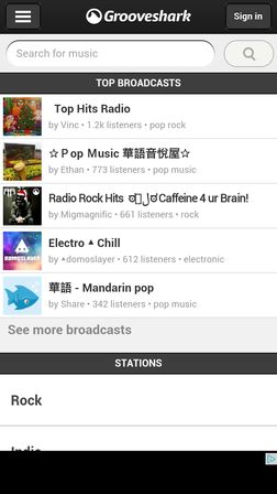 After running the app, you will see a list of currently featured Grooveshark broadcasts. Further down below, full list of available stations is gonna be showed where they can be browsed. Use the search at the top to find the artists that you like and create playlists of your own.