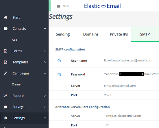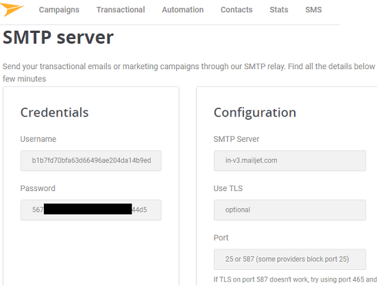 SendinBlue is yet another free email marketing platform which you can use to send emails in bulk. In the free plan, it lets you send 300 emails per day. You can sign up for a free account and then obtain the SMTP server credentials to start sending emails from your application or any third-party SMTP program. Just create a free account and then get the SMTP access. Also, if you want then you can use its flexible API to send emails. And API is useful for adding email functionality in your application as well. It offers you various code snippets in different programming language. You can use other features and tools that it offers and then do whatever you want.