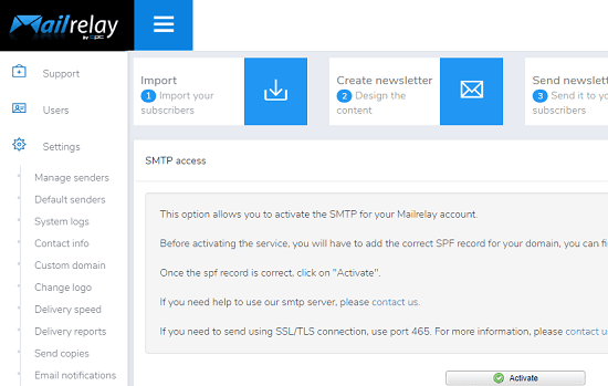 MailRelay is an email marketing platform which gives you addicted SMTP relay for mass mailing. In the free plan, it lets you send 15000 emails and you can have 3000 subscribers in your list. Also, there is referral kind of program too to increase the number of emails to 75000 by posting links to the website on social media platforms. You can sign up for a free account and then send emails using the SMTP server whose details it will give you. However, to use this service, you must have a verified domain email. You will not be able to send emails if you don’t own any domain. It ask you to tweak certain DNS settings in order to verify your domain and then you can create an email address for you using this service.