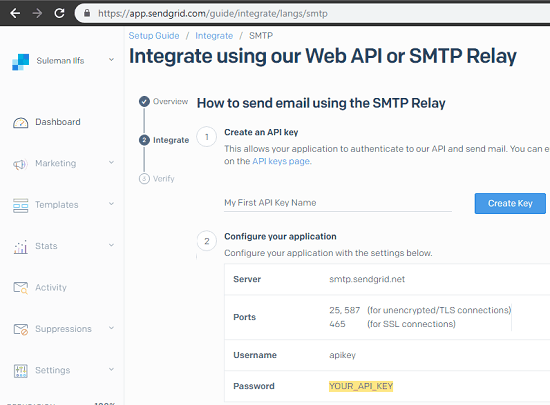 On the main interface, you can see the other tools that it offers and configure other settings as well. You can generate API keys and delete the previous ones. The SMTP details are in the Setup Guide > Integrate > SMTP section. You can see the SMTP server and API credentials which you will need for the SMTP client or the software you use for sending the emails. This website maintains the analytics of the emails that you send through it. There are a lot of marketing and transactional email templates that you can use and then see the full analytics of the emails that you have sent so far.
