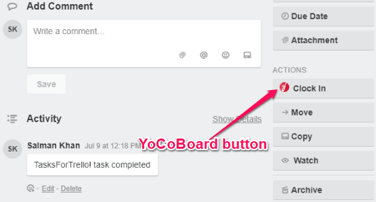Step 2: Now, when you expand any Trello card, you can see a new YoCoBoard “Clock In” button in the “Actions” section. To start tracking the time spent on that specific card, all you gotta do is hit the “Clock in” button. Now, it will automatically log the tracked time on your YoCoBoard dashboard. When you’re done with working on the card, just click on the “Clock Out” button to stop time tracking.