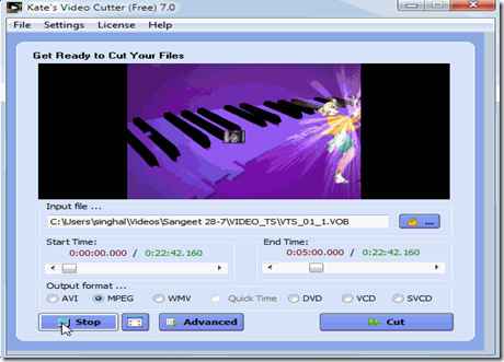 Kate’s Video Cutter is another free video cutter that you can use to cut videos quickly and easily. The software has a simple looking interface and supports multiple file formats like AVI, MPEG, WMV, and more. You can simply open the video on the interface and select the start and end time of your video. Before you finally hit the “CUT” button, the software also lets you preview the video you are about to generate. The “Advanced” button, next to “preview” button, lets you preview the video in a separate window, where you can play, pause, stop the video any time.