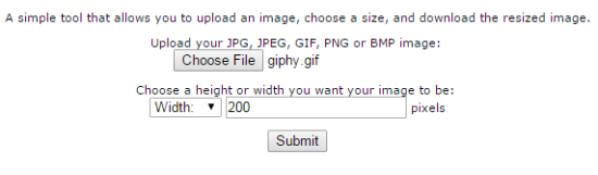 The last resizer for you in the list is from Universal Web Services. This free online resizer lets you resize JPG, JPEG, GIF, PNG, and BMP image format. You simply have to upload the GIF file and then choose width/height as per your desire. After this, click on Submit button and the processing part will start. Once processing is done, the output file will be downloaded automatically.