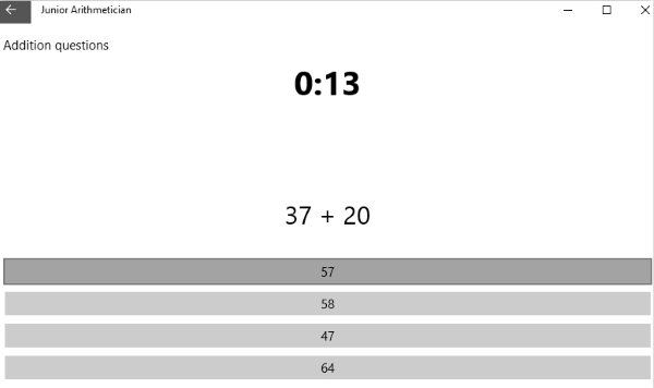 Junior Arithmetician is a fun app for kids of grade 4-5. The app focuses on 4 topics addition, subtraction, division, and multiplication. The home page of this app can be seen in the screenshot above. You can pick out any of the four topics which you want to practice. When you pick out a topic, you will immediately be taken to the first question under that topic.