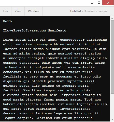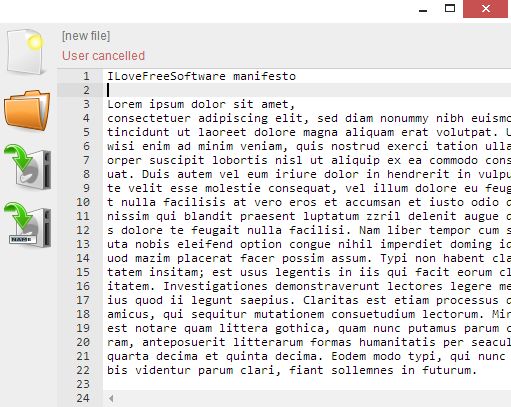 You can see that it’s very simple, without any kind of advanced toolbars or anything like that. Left sidebar only holds 4 options, for creating new files, opening old ones and saving (Save and Save As).