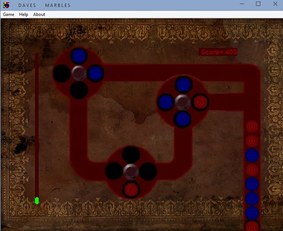 In Daves Marbles there’s actually several puzzles going on at the same time. There are 3 wheels which all need to be filled out with the same colors of marbles for the green timer on the left to refill. Should the time run out, you lose the game. Wheels can be rotated and marbles moved between them using the mouse. As you progress through the levels, you’ll be given new colors of marbles to make things more difficult. Open up Help >> Instructions to figure out how everything works.