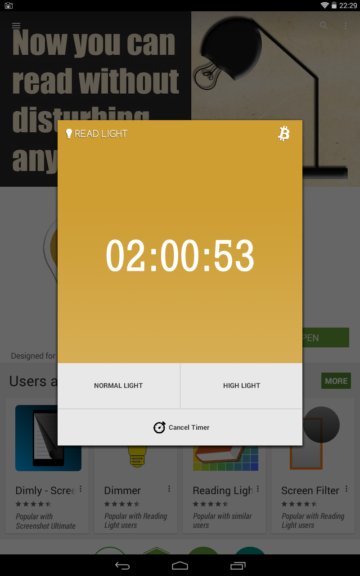 After launching the app, first the settings tweaker pops out. Here you’ll need to choose whether you want to use the camera flash or the screen as a reading light. Another thing that you are able to setup is a timer, to turn off the light after up to 24h has passed.
