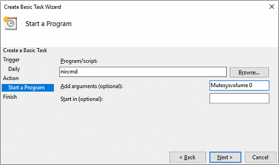 - Under Action, enable “Start a program” option and click Next. Now, type “nircmd” in the program name or browse the nircmd.exe file if you did not add NirCmd to your Windows Directory. Then, type the desired NirCmd volume command with a value (mentioned above) in the arguments.