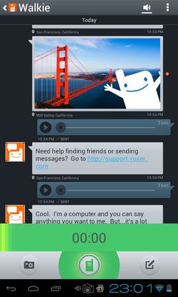 You’ll get your very own username with the help of which your friends can find you. Once you’ve built-up your contact list, you’ll be able to start communicating with your friends by tapping on the “speak” button and sending messages to friends. They can do the same for you, see image above.