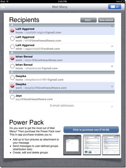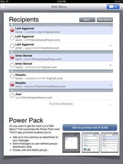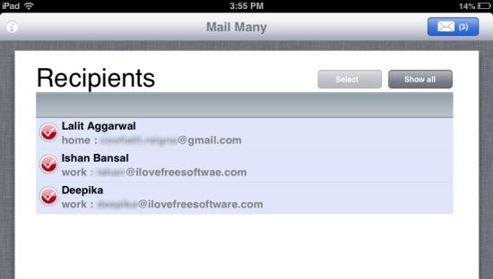 So, selecting the email addresses from contact book and sending the email to multiple email addresses has now become easier and faster with this Mail Many app for iPad.