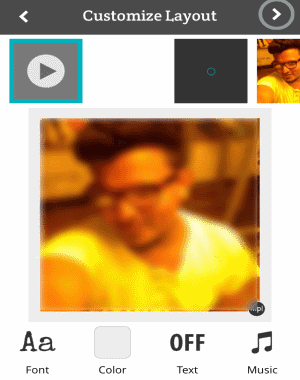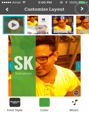 Step 3: After that, tap the “Arrow” icon at the top to proceed and open up the customizer. At the top of the customizer, you’ll see all the pre-designed animated layouts and the customization options at the bottom. You can select any of the pre-designed animated layouts for your post with just a tap. The animated effect will be added as per the selected layout and your added photos will be played as a slideshow in the post. If you’ve added text overlays, then you’ll see options like Font Style and Color at the bottom to customize the text.