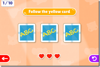 - Follow Card: This game consists of three different cards with each of them displaying one animal. After showing animals to you, app inverts and shuffles them. Before the inversion and shuffling, you will see that one of the card is highlighted. So you have to find the correct position of this highlighted card after the shuffling is over. This way, you have to find 10 correct cards to win the game.