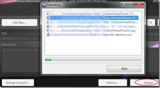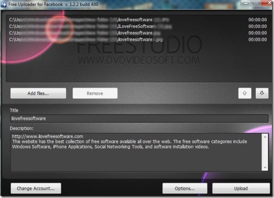 Its interface is beautiful as it is visible in below screenshot and all of the required options are available on main window. Working with this Facebook uploader is an easy task as it requires only three steps. These are: sign in to your Facebook account to authorize Free Uploader for Facebook, add files from your computer & hit the Upload button.