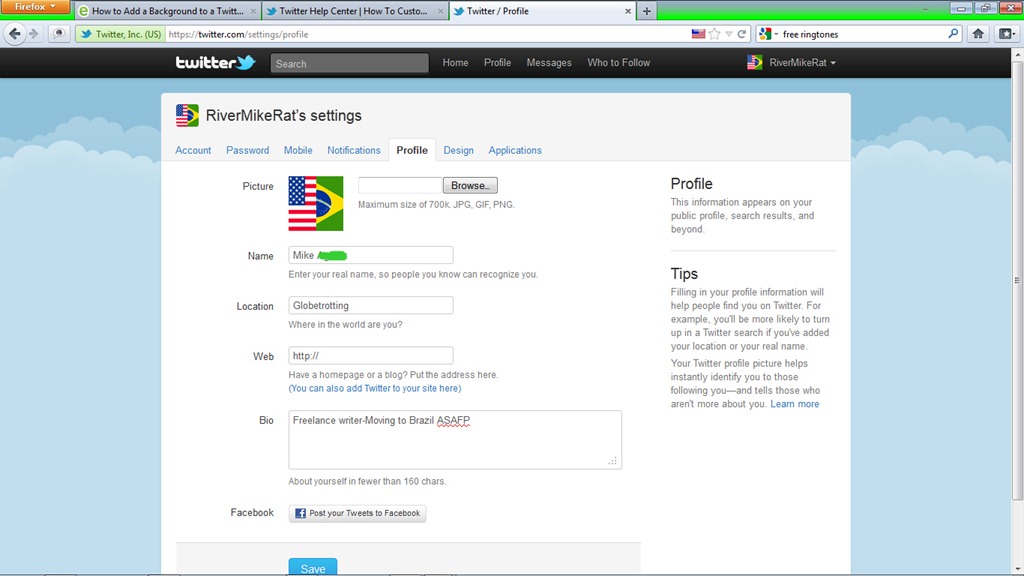 The background image on your Twitter profile page is a great way to let people know your moods, or your interests. There are nineteen default backgrounds that Twitter makes available to everyone. These default backgrounds include Birds, trees, and flowers which aren’t to everyone’s liking. This is where using your own images as your background comes in handy. On the top, profile settings menu, select Design. You can choose one of the default themes, or use your own. To use your own, click the ‘Change background image’ button and browse to the desired image on your hard drive. You can choose to tile the image so that it fills the page, or you can leave it on the left side of the page. Click ‘Save Changes’ and your page background will update to reflect the choice you made.
