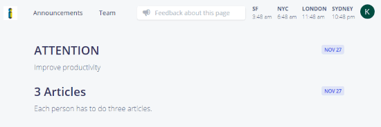 The very first thing you need to do is to install this Chrome extension. Open a new Chrome tab, after that, it will show you a demo. Thereafter, you can signup/login to invite team members and create announcements. At the top of the page, you will see two options named Announcement and Team.