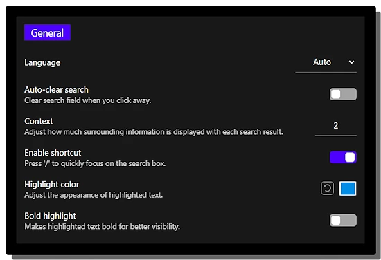 This extension also has a handful of settings. You can access that either from the extension settings or by tapping on the gear icon in the search panel. The settings let you set the language, highlight color, make the highlighted text bold, and enable a search shortcut. Along with that, it also lets you toggle auto-clear search and adjust how much surrounding information you want to see with search results. You can configure these options as per your liking and use the extension to search through your ChatGPT chat history.