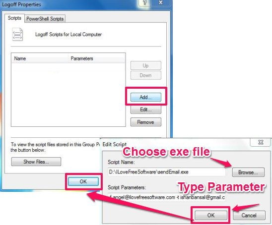 Step 3: Then click on the Add option in the window that opens up. In the Script Name, browse the path of exe of SendEmail software that we downloaded in Step 1 (or any other email software, if you want).