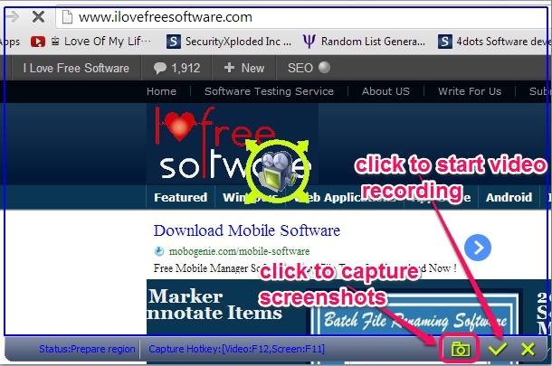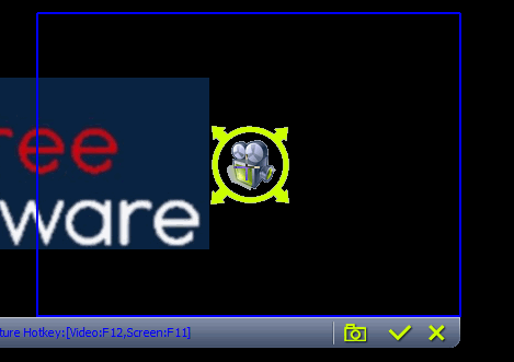 Now, a frame will be available in front of you, just like visible in screenshot below. At the bottom part of this frame, two main icons are available. A camera icon to capture screenshots and a right tickmark icon to start video recording. Use any icon according to your requirement or else you can also use hotkeys.