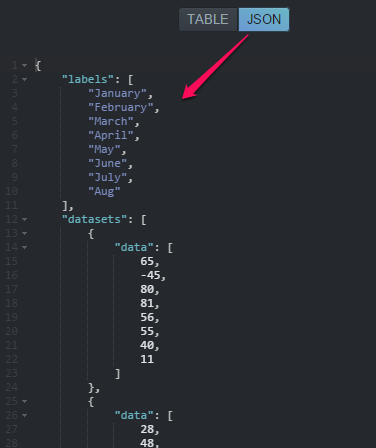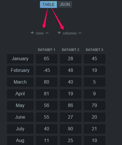 You can use a data table with custom rows and columns to create the dataset and immediately turn the output to a line or bar chart. Apart from this, data can also be generated using JSON. JSON (or JavaScript Object Notation is actually a format which is used for data structuring by entering the input in human readable format.
