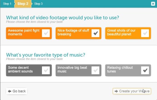 The second step allows you to specify your choice of video footage and type of music for your remix. After choosing the desired options, you can move further and jump to the last step.