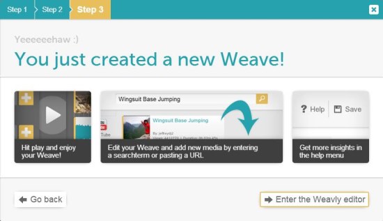 The third and final step will open a wizard which tells that a sample video has been created picking up media elements from the supported sources based on your preferences. You can either play the preview of that video remix or enter the online Weavly Editor to edit the contents of video.