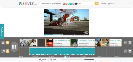 The Weavly Editor offers various useful tools to edit the remix video. You can access individual contents of the video using the timeline and delete any of them which you don’t like. And in case you want to add more contents to the video, you can search for them by entering a search term in the search bar on top of the Editor window or by entering the YouTube, Vine, SoundCloud, Loopcam, Tumblr, or Imgur URL of the media content.
