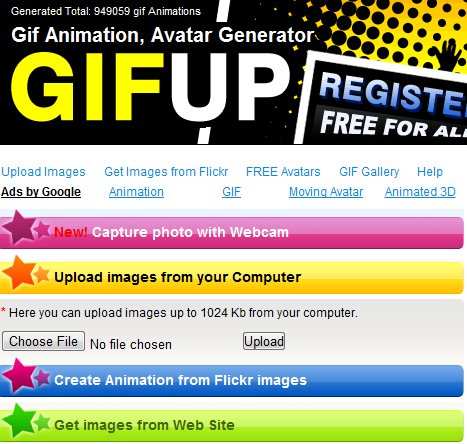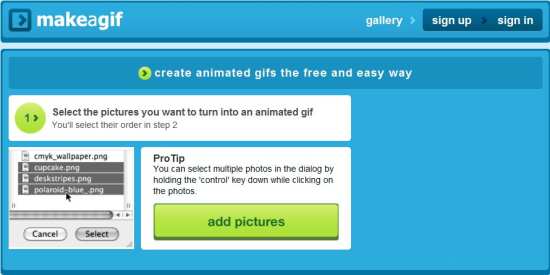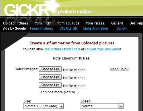Gickr lets you create your own gif for free of cost without using any further external software or hardware. This web application is easy to use and offers you customized settings for creating your personalize gif. Just upload your pics from your computer or directly access to Flickr account. You add max up to 10 files to this application, which are appropriate for creating gifs.