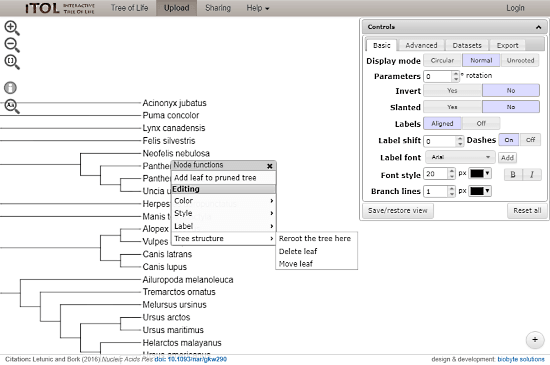 iTOL is an online Phylogenetic Tree Maker which lets you visualize, annotate and export Phylogenetic Trees. It has three different modes for visualizing the tree. Reading a large Phylogenetic tree is not so easy. But, you can make it less complex here by applying annotations, adding font and label colors. You can also apply datasets to your tree here and can export it into vector graphics, PDF, and various tree formats.