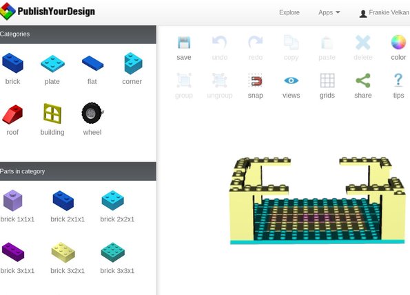Top right corner, only a fraction of which can be seen above, also has a menu for switching between 3D designer, Lego builder and Design Viewer. To use Publish Your Design you’ll have to register an account on the website.