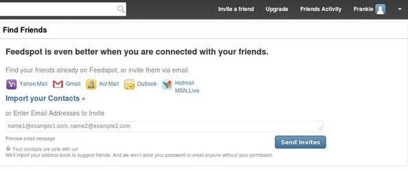 FeedSpot also has a social note. You can become friends with other users and that way see what kind of RSS feeds they’re keeping track of. Notice the Friends Activity option in the top right corner menu.