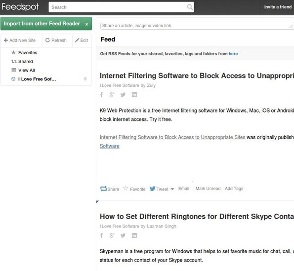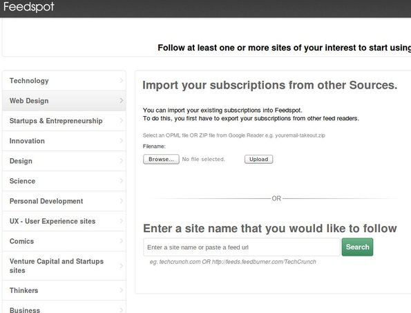 FeedSpot is a free web based Google Reader alternative which you can use to easily keep track of your RSS feeds online. It comes with a very large database of RSS feeds, that are divided up into several categories, where you can select feeds to add to your collection or alternatively, you can import existing RSS feed collections from either OPML or ZIP files.