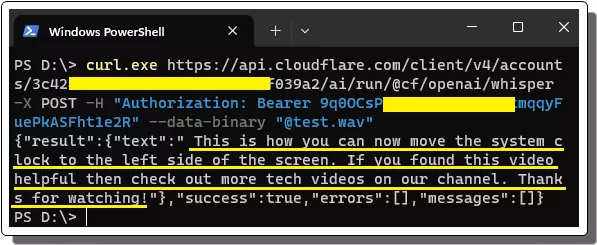 curl.exe https://api.cloudflare.com/client/v4/accounts/Account_ID/ai/run/@cf/openai/whisper -X POST -H "Authorization: Bearer API_Token" --data-binary @test.wav