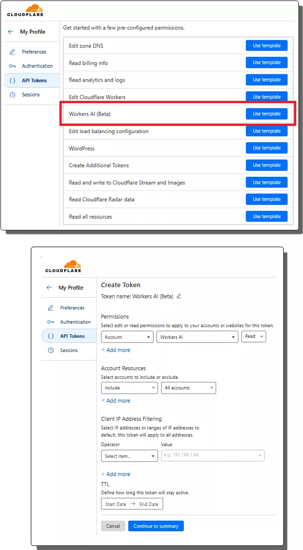 Now go to Cloudflare API section and the create a token. Select Worker AI template and then proceed with the default values.