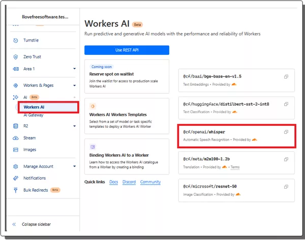 To deploy your own instance of Whisper on Cloudflare, you just log into Dashboard and then go to the Worker AI section. From here find the speech to text model and deploy it.