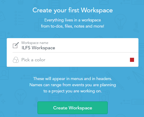 Go to this link to access the homepage of this website. Create your free account and your first work space (personal work space). You can give a custom name and choose a color for your work space.