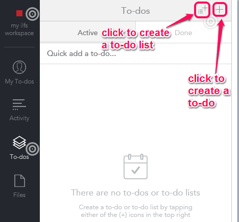 When the work space is created, you can create to do lists and add to-dos to those lists using the available options.