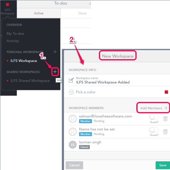 When you have to collaborate with others and assign them tasks, you need to create a shared work space. To create a shared work space, click on the Overview icon (available at top-right corner) and use ‘+’ icon available to create a shared work space. After this, you have to set name, a color label and add members by entering their email addresses to create your shared work space.