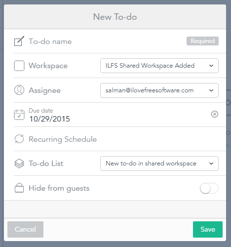 Now when the shared work space is created, it’s time to create a to-do list or to-do. While adding a new to-do, it provides options to add to-do name, assign it to a particular member, set a due date, etc.