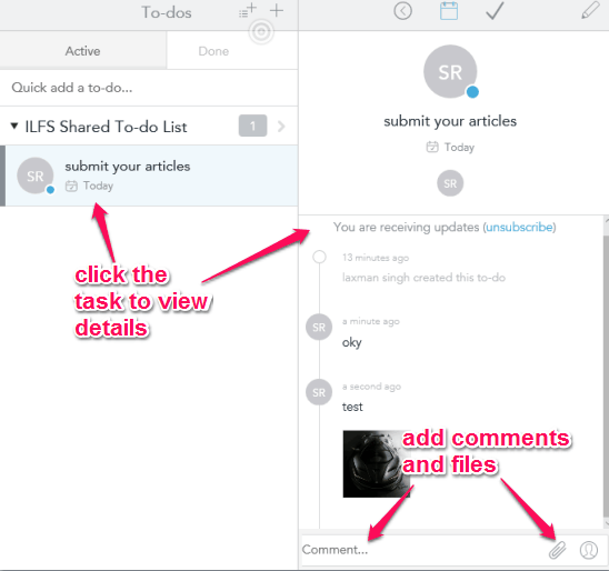 You can create personal or shared work spaces, add to-do lists in those work spaces, and further insert to-dos in those lists. You can also mark any task as done or change its status to later. For each individual task, it also lets you add comments and upload files (images, text files, etc.).