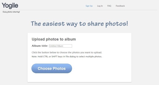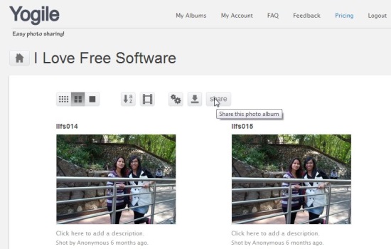 Yogile is a free, online photo sharing service that allows you to upload bunch of photos to an album and share them with your friends. The great part is that others can also upload photos to your album, without the need of registering with the service or making any account. This keeps them free from the hassle of providing their private information, side by side allowing them to easily contribute to your album. In this way, the overall photo sharing becomes incredibly fast and private among groups. This might be a good idea in cases when all of you take pictures on a common occasion, from different angles with different devices, and want to share them with each other.